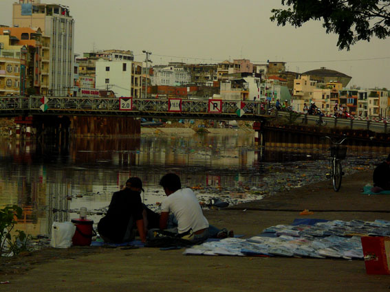 Famiglie da tutta la provincia vengono a Kampot anche per un’altra, modesta, attrazione. Le definiscono cascate, di solito senza fare un precisazione d’obbligo: cascate “durante le piogge”, dacchè in questa di stagione si risolvono in un fiumiciattolo d’acqua opaca e azzurrognola dove, proprio volendolo, ci si può immergere fino alla vita. I cambogiani ci vengono tutto l’anno, comunque, ogni famiglia si accovaccia in cerchio su certe precarie piattaforme di bambù poggiate sugli scogli, e lì si fa portare da mangiare un bel pollo arrosto o dei frutti di mare alla griglia, non prima di aver fatto uno shampoo a mollo nel fiume a tutti i componenti del nucleo, dai bebè ai nonni. Gli piace molto, in quattro giorni ci hanno portato lì ben due volte, senza che noi riuscissimo in nessun modo a declinare l’invito. Fanno bene a godersele le loro, per così dire, cascate, visto che qualche centinaio di metri più a monte le ruspe stanno già scavando per la costruzione di una diga che farà piazza pulita delle bucoliche scappatelle domenicali degli abitanti di Kampot.