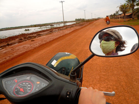In campagna, anche se è solo apparenza e i giovani sciamano in motorino a cercar lavoro nelle città, sembra invece tutto immobile e antico. Non abbiamo visto che di rado campi grandi e coltivazioni uniformi: il più del tempo la campagna è tutta frammentata in piccoli appezzamenti e punteggiata di case unifamiliari su palafitte o di muratura, una campagna variegata e piena di animali che girano qua e là e attraversano le strade indisturbate tra i clacson impazienti, terra coltivata e solcata di sentieri e strade sterrati in cui si incrociano le Honda e i carri di buoi contendendosi la precedenza. Abbiamo conosciuto un giovane bonzo qui a Phnom Penh che ci ha invitato a passare un week-end con la sua famiglia in campagna a Kampong Trach, vicino a Kampot (i cambogiani sono in generale molto religiosi: tre anni in un monastero sono un modo per ottenere meriti spirituali per la prossima reincarnazione, oltre al fatto che vivere in una pagoda è spesso un buon modo di proseguire gli studi senza essere troppo di peso alla famiglia). Casa loro è a pochi chilometri da confine vietnamita, nell’area del delta del Mekong: la terra è fertile e morbida e loro ci coltivano patate dolci durante la stagione secca e riso durante quella umida. Vivono in otto adulti, quattro fratelli e sorelle coi rispettivi coniugi, due bambine, un neonato già nato e un altro che arriverà a breve in una casa di muratura di quattro stanze, con il bagno (acqua piovana) e la cucina (a legna) all’esterno del fabbricato.