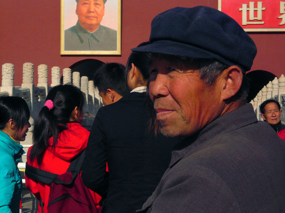 Varcato un secondo immenso portone, adagiato in una teca di vetro e illuminato in volto da una sinistra lucetta arancione c’è Mao, l’ultimo vero imperatore della Cina, con una bandiera rossa a mo’ di copertina, con la temperatura che c’è l’idea di tenergli i piedi al calduccio non sembra poi così strana. Anche qui è vietato fermarsi. Tutti sfilano veloci ed escono silenziosi, attraversando soprappensiero il negozio di souvenir con qualche lacrima sul viso, i giovani, gli stessi che vedi spulciare tra le spille e i gadget della rivoluzione culturale nelle bancarelle degli antiquari ,e i vecchi, tanti con la divisa blu e il berretto d’ordinanza, in volto le rughe di chi credeva di averne viste già troppe e ora non sa più bene cosa aspettarsi.