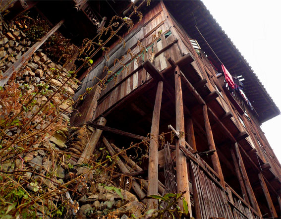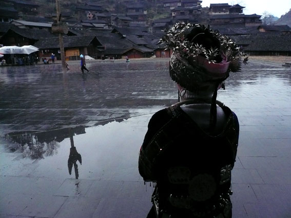 Ringraziando i giovani ingenui cinesi che vogliono praticare l’inglese e farsi amici stranieri per trovare un buon lavoro e guadagnare tanti soldi (sic) siamo riuscite a ottenere un biglietto per un autobus diretto a Xijiang, un villaggio Miao. Unico compagno di viaggio un vecchietto con due anatre appese a mo’ di fagotto. Il paese è fatto tutto di grandi case di legno costruite su palafitte e occupa tre intere colline, sui cui pendii si inerpicano stradine tortuose di sassi e fango. Non ci sono automobili, naturalmente, e i bambini giocano per la strada fino a tarda notte con le trottole di legno, corrono dietro ai cani e fanno gare di corsa sui gradini in discesa. Le donne portano maestose acconciature fissate in cima alla testa e decorate con un’accozzaglia di oggetti: spille d’argento lavorato, vistose rose di plastica rosso fuoco, pettini colorati e altri fiocchetti variopinti. Tutt’intorno al paese sono orti di cavoli e terrazze di risaia che salgono fino alla cima delle colline: ogni singolo fazzoletto di terra è sfruttato, ogni ansa del terreno coltivata, curata, umanizzata. Tra le vie del paese in mezzo al viavai dai campi di persone che portano pesanti gerle sulle spalle, scorrazzano cani, maiali, polli, anatre e un’oca solitaria. Ogni tanto si vede passare una mucca al guinzaglio o un mulo al lavoro, ma di rado.