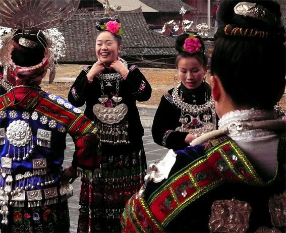Oltre che di agricoltura e di allevamento i Miao vivono ovviamente anche di turismo. Quasi ogni giorno uno o due autobus (ma la strada asfaltata risale all’anno scorso) portano a Xijiang una comitiva di turisti cinesi affamata di spettacoli tipici e di pietanze piccanti. Nella piazza centrale del paese, al centro della quale si innalza un curioso totem di legno, secondo un rituale che si ripete uguale ogni giorno, vengono fatti accomodare su panche di legno gli onorevoli ospiti. Due grossi altoparlanti accompagnano la musica dei flauti di bambù suonati da uno sparuto e spennacchiato gruppetto di uomini. Le donne si prodigano in danze e canti, vestite di tutto punto con tintinnanti monili d’argento, e tra grida e sorrisi forzati fanno trangugiare da corni di bue ai tapini forestieri litri dell’energica grappa di riso che si produce da queste parti. Il tutto non dura, per fortuna visto che si svolge pochi a pochi metri dalla nostra finestra, non più di un’ora, a volte anche una mezz’oretta per i gruppi più squattrinati. Appagata la dubbia curiosità e il desiderio di esotica bizzarria, i cinesi, orfani essi stessi della loro millenaria tradizione, nonché della robusta ideologia degli anni più recenti, ripartono felici dopo aver svuotato i portafogli alle botteghe che s’affacciano sulla piazza. Questa raffazzonata messinscena, seguita con noncuranza dagli abitanti del paese, fa sorridere amaro e lascia presagire il futuro prossimo di queste comunità fino a poco tempo fa isolate dalla storia che ora si ritrovano alla mercè dell’industria del divertimento e del turismo di massa.