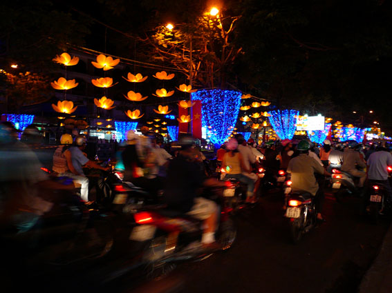 Saigon non s’è fermata neanche un minuto. Allo spettacolo di draghi e ballerine succinte organizzato davanti all’hotel Continental eravamo in quattro gatti: la zona era chiusa al traffico e nessuno scende mai dal motorino a Saigon, nemmeno a capodanno. Si sono tutti limitati a parcheggiare nei dintorni, aspetttando di sentire il conto alla rovescia che annnunciava l’inizio del nuovo anno. Poi, immediatamente, tutti hanno messo in moto e hanno iniziato a guidare come pazzi per raggiungere la riva del fiume, a cinquecento metri scarsi da lì, e piazzarsi col motorino in una buona posizione per vedere certi striminziti fuochi d’artificio che venivano sputacchiati in su da dietro degli enormi palazzi, sempre comodamente seduti, in quattro, sul proprio motorino. Non si riusciva a camminare per le strade senza bruciarsi i polpacci contro le marmitte incandescenti delle Honda pigiate le une alle altre. E’ stato un attimo. Tutti a naso in su a commentare con un oooohhh i pochi bagliori pirotecnici che riuscivano ad arrivare abbastanza in alto da risultare visibili dalla strada. Grande ombrello di lucine arancione: è il finale. Senza nemmeno guardare avanti tutti hanno ingranato al prima e sono partiti, coi bambini che correvano dietro alle moto perché erano rimasti a terra, passandosi sui piedi a vicenda con le ruote, incastrando le carrozzerie di plastica le une alle altre in una nuvola di fumo…dove corrono ancora? Ma che domande. Al tempio, in chiesa, alla pagoda: a far le offerte. In pellegrinaggio, con lunghe torce accese o con incensi nelle mani inghirlandate di fiori bianchi, in motorino naturalmente. Può sembrare incredibile, ma, sarà che all’odore di smog ci si abitua e non lo si sente più, per le strade si sentiva la fragranza dolciastra dell’incenso che bruciava.