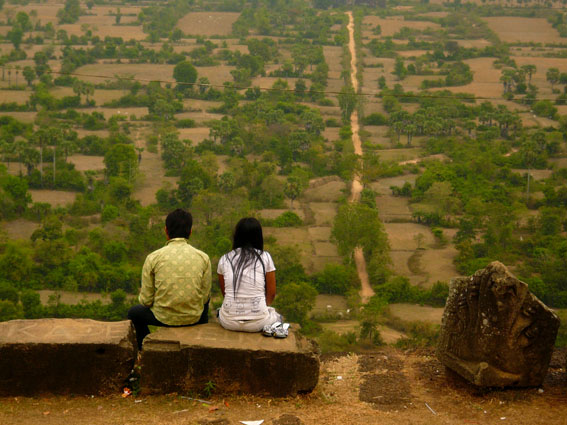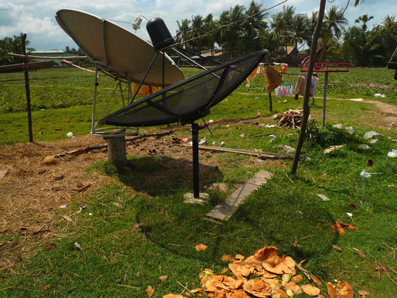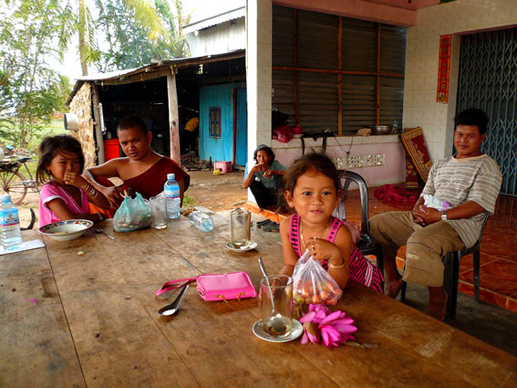 In campagna, anche se è solo apparenza e i giovani sciamano in motorino a cercar lavoro nelle città, sembra invece tutto immobile e antico. Non abbiamo visto che di rado campi grandi e coltivazioni uniformi: il più del tempo la campagna è tutta frammentata in piccoli appezzamenti e punteggiata di case unifamiliari su palafitte o di muratura, una campagna variegata e piena di animali che girano qua e là e attraversano le strade indisturbate tra i clacson impazienti, terra coltivata e solcata di sentieri e strade sterrati in cui si incrociano le Honda e i carri di buoi contendendosi la precedenza. Abbiamo conosciuto un giovane bonzo qui a Phnom Penh che ci ha invitato a passare un week-end con la sua famiglia in campagna a Kampong Trach, vicino a Kampot (i cambogiani sono in generale molto religiosi: tre anni in un monastero sono un modo per ottenere meriti spirituali per la prossima reincarnazione, oltre al fatto che vivere in una pagoda è spesso un buon modo di proseguire gli studi senza essere troppo di peso alla famiglia). Casa loro è a pochi chilometri da confine vietnamita, nell’area del delta del Mekong: la terra è fertile e morbida e loro ci coltivano patate dolci durante la stagione secca e riso durante quella umida. Vivono in otto adulti, quattro fratelli e sorelle coi rispettivi coniugi, due bambine, un neonato già nato e un altro che arriverà a breve in una casa di muratura di quattro stanze, con il bagno (acqua piovana) e la cucina (a legna) all’esterno del fabbricato.