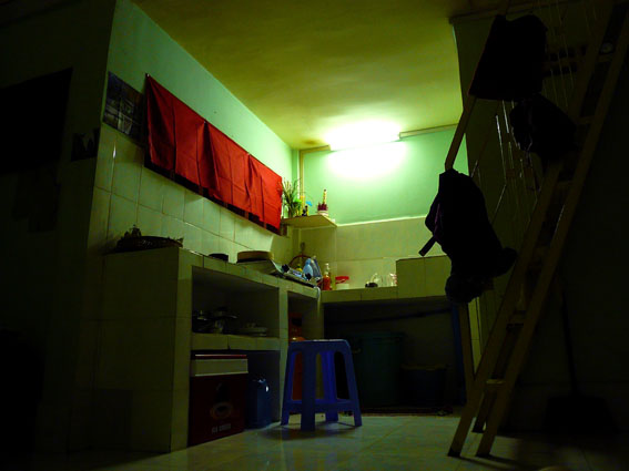 Siamo ancora a Phnom Penh e ormai fa quasi un mese e mezzo: abbiamo affittato per novanta dollari al mese, un prezzo esorbitante, una casa all’ultimo piano di un palazzo che sta sull’angolo tra la via 164 e la via 139 (sono stati i francesi a inventarsi questo originale sistema di denominazione delle strade, numeri pari per le vie orizzontali e dispari per quelle verticali), proprio dietro il mercato di Orussey. Abbiamo svuotato gli zaini, recuperato materasso, pentole e una bombola del gas, anche se in verità la nostra vicina cucina a legna sul balconcino comune, cosa che forse si aspettavano facessimo anche noi. La casa era completamente, assolutamente vuota, fatta eccezione per due altari con i fiori freschi e le candele elettriche accese, curati e lucidati come il resto della casa non è probabilmente stato mai.