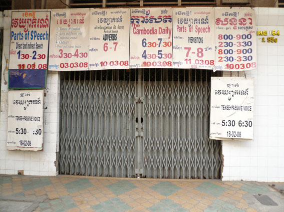 La cugina di campagna voleva fermarsi ancora un poco per praticare l’inglese, ma io ho declinato perché è una cosa noiosissima. Sembra che tutti studino inglese in Cambogia. Sembra quasi un dovere. Chi non ha un secondo lavoro alle cinque va a studiare inglese. Purtroppo sembra che per imparare l’inglese qua si debba imparare a intavolare delle conversazioni idiote, o più precisamente: affettate, convenzionali, forzate . Come quelli che ti parlano della propria scuola di lingua come di un “campus”, che ti sciorinano le proprie “skills” e ti chiedono cose tipo: “what’s your favorite hobby?”