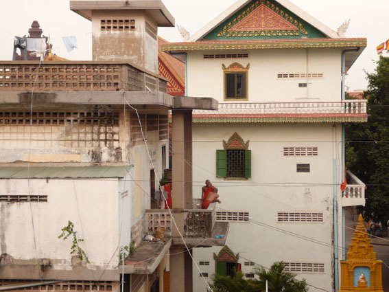 Phnom Penh è piccola, più di Milano, e il peso specifico della sua diversità intrinseca stupisce. Nessuno fa grandi sforzi per assomigliare al posto dove vive. C’è chi stende un’amaca tra un semaforo e un palo della luce e fa una pennica come fosse lì a dare un’occhio alle mucche che pascolano. C’è chi gira con dei 4per4 enormi come fosse ad una safari. Il fatto stesso che io viva qui, al quarto piano di via 139 numero 30, ha a che vedere con questa eterogeneità quasi assurda. Sembra una polla piena d’acqua e olio e non si mischiano se non quando scuoti per bene il contenitore, e, anche quando lo fai, dopo cinque minuti tutto è già tornato come prima. Salti sulla bicicletta e inizi a pedalare verso il fiume. Passi dal quartiere intorno alla pagoda, e, se ti fermi cinque minuti ad aspettare, arriva sempre un vecchio che ti apre la porta di certe cappelle minori, ti fa sedere in terra e inizia a dire parole in rima spruzzandoti addosso dell’acqua. Sui gradini delle casette a due piani, perlopiù squattate, manciate di uomini con solo una krama legata sui fianchi se ne stanno seduti a giocare a carte. I giovani monaci in servizio alla pagoda se ne vanno in giro nei loro venerandi mantelli arancione con l’aria un po’ pretizia, con le mani giunte e gli occhi bassi, e lanciano via via i loro hello! alle signorine di passaggio (sono piuttosto tamarri, a pensarci bene, con le ciabatte di cuoio e gli occhiali da sole sul cranio rasato. Questa è una cosa che all’inizio destabilizza un po’ ma poi diventa divertente perché ti permette di conservare un certo margine di sano ateismo qui dove tutto sembra avere un alone sacro di reverenda rispettabilità). Continui il tuo giro in bicicletta e passi dalla zona delle villette e dei palazzotti di appartamenti fully furnished degli stranieri, dove c’è solo filo spinato e Land Rover. Tiri dritto fin quando arrivi sul lungofiume e lì i palazzi coloniali hanno gli stucchi freschi e i fiori sui balconi. Sui marciapiedi i bambini vendono copie pirata delle guide Lonely Planet (vale a dire fotocopiate e rilegate con una passatina di colla) e offrono la loro sorella al bavoso di turno. E tutto è così vicino, a tratti sovrapposto, perché la città è piccola e anche abbastanza nuova.