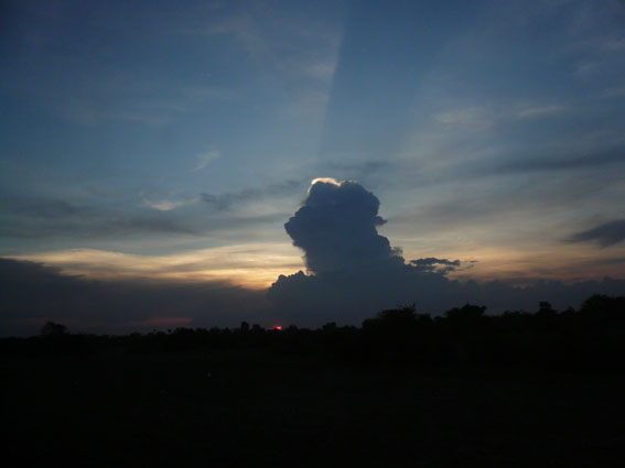 Al tramonto Neth, il responsabile di una ONG cristiana che lavora con gli indigeni (non fatemi dire cosa penso delle ONG dopo cinque mesi di Cambogia…), mi porta in cima a una collina più alta delle altre a vedere il sole tramontare dietro una distesa di foresta che sembra non finire mai in nessuna direzione si guardi, mentre l’umidità della sera sale da questa morbida distesa verde e si raccoglie in nuvole sfilacciate che sembrano stare appoggiate sui rami più alti. Cala la sera e corriamo in moto verso la sommità di un’altra collina, dove c’è una costruzione di pietra a pianta tonda con dentro la statua di un anziano appoggiato al suo bastone, e fiori, piante, ghirlande, piatti di pollo e oggetti devozionali di tronco di banano: c’è un altro spettacolo che non posso perdermi. Lo spettacolo è la microscopica città di Sem Monorom che si illumina di neon mentre in cielo si spengono gli ultimi bagliori arancione del tramonto e si accendono le stelle una ad una. Neth dice che Hong Kong lui se l’immagina così, come un prodigio di luci artificiali che fanno sognare la città.